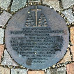 Vor dreißig Jahren, 1990, sollte der Adlerweg in Hinterzarten ein neues Gesicht bekommen. In diesem Zusammenhang bot die Evangelische Gemeinde an, vor ihrem Gemeindehaus ein gestalterisches Element einzubringen. Das Siegel der Gemeinde Hinterzarten, das Kreuz zwischen zwei Tannen, ist auf der Bronzetafel am Glockenspiel angebracht.